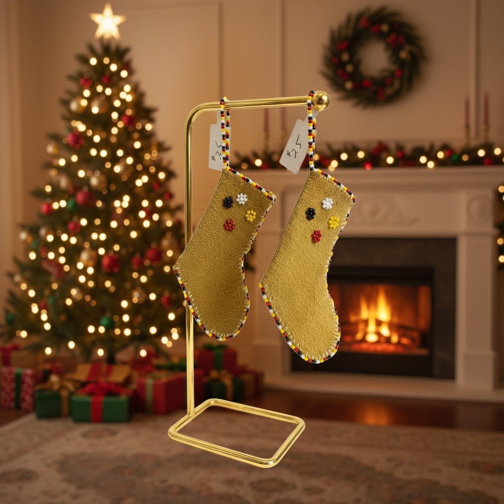 Made from deer hyde. Measures 4 1/2 inches long x 2 inches wide. Using the 4 colours of the medicine wheel of yellow, red, black, and white in 11/0 seed beads. All sewn on soft suede deer hyde. It makes a cute decoration for your tree.